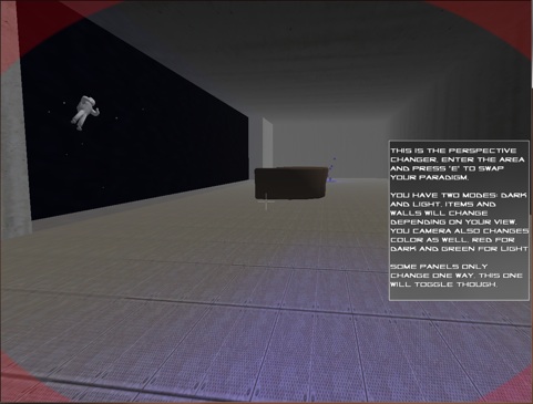 SPSU Fall Game Jam 2012 - This project was done at the SPSU Fall Game Jam 2012. The theme for the Game Jam was “Eye of the Beholder.” Our team took this in very literal sense and used common phrases such as “Beauty is in the eye of the beholder.” This gave us the idea of a puzzle based game with perception being the key mechanic. The idea is that you are on a space station and some weird toxin has been release that allows you to see in 2 perspectives. In order to get through the puzzles, you will need to use stations that can change your perspective. Some items, walls, and pickup’s will shift in and out of view depending on your perspective. This is a first person style puzzle game.